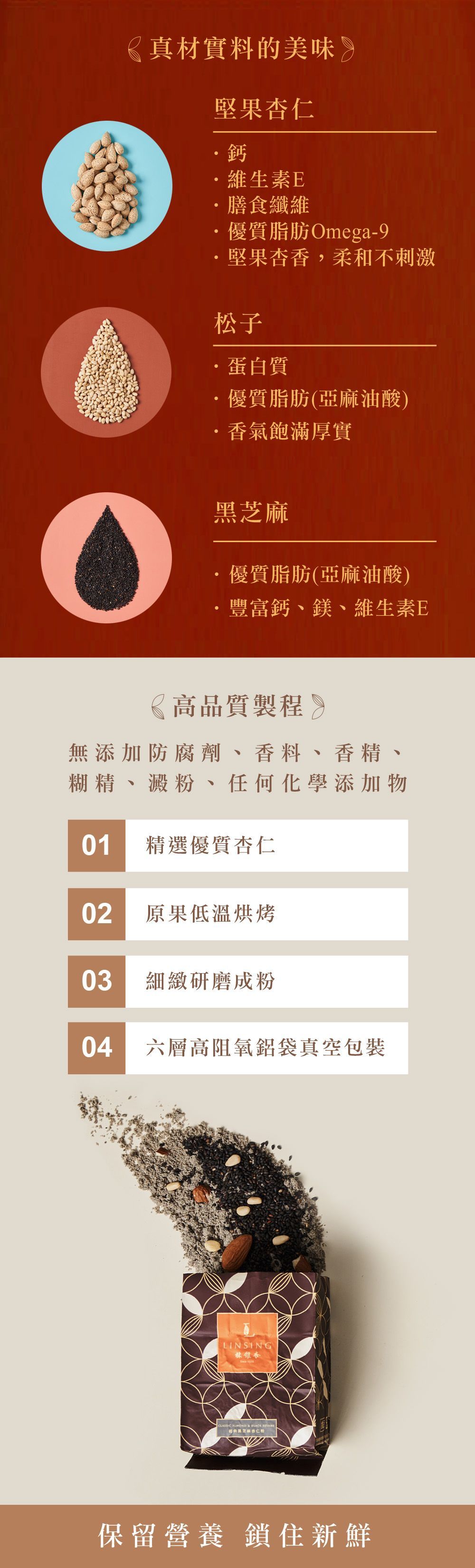產品成份: 黑芝麻、杏仁、松子