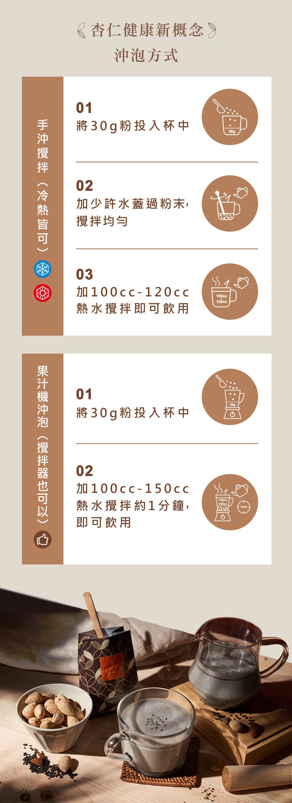 使用方法: 請將1/3包杏仁粉放入杯中,先少許溫水或冷水調勻後,再加入熱水或冰水攪拌即可(詳情請參照盒內內袋包裝)