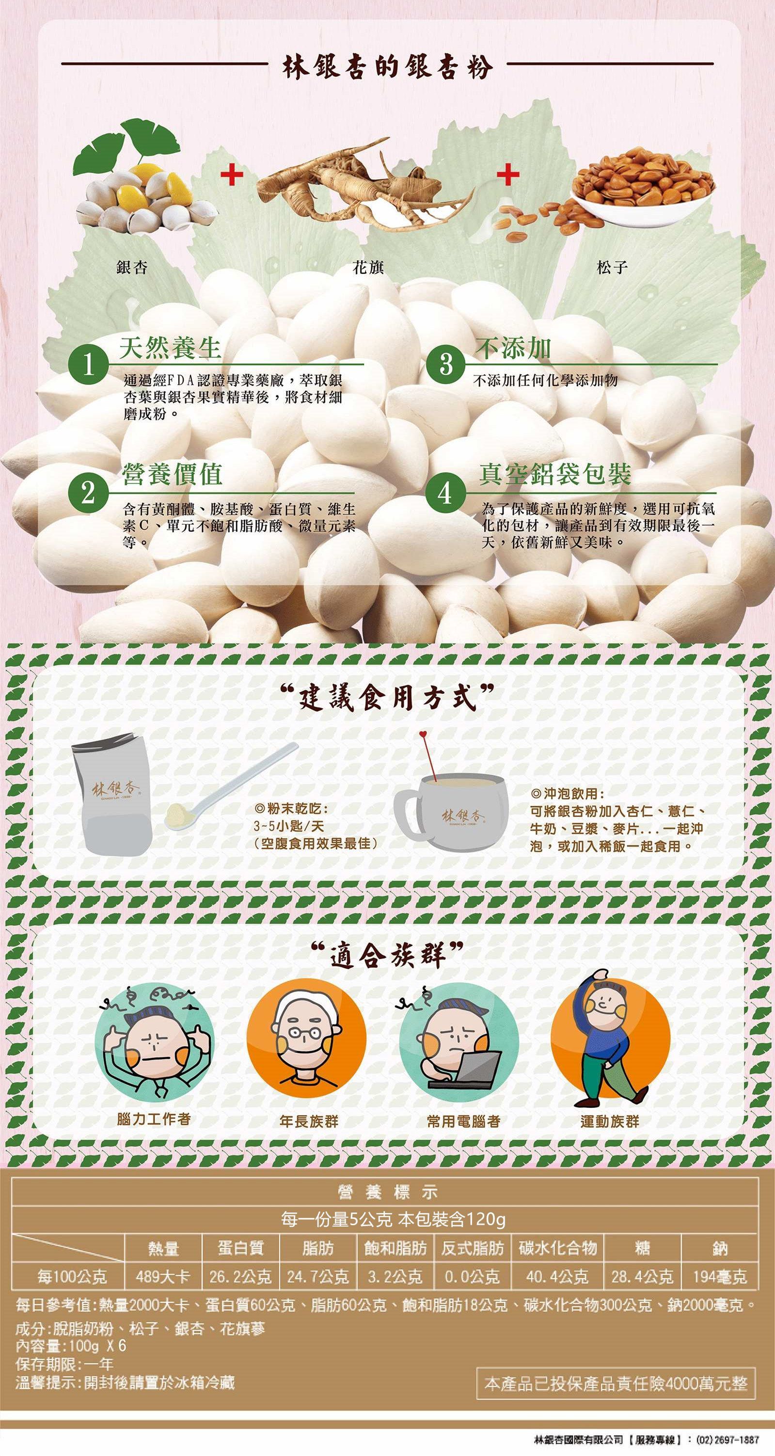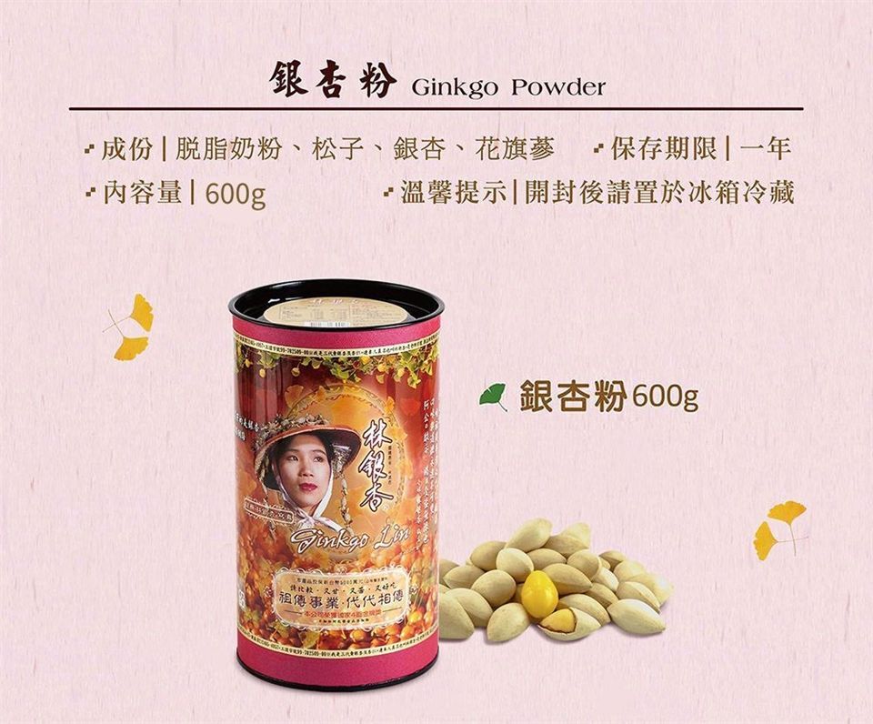 產品成份:奶粉、松子、銀杏、花旗蔘